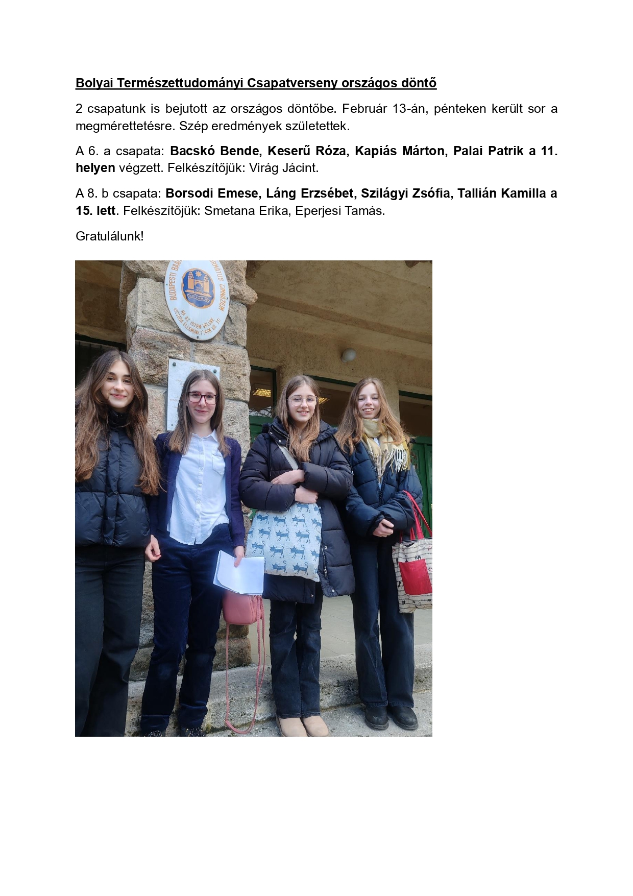 január 9-én rendezték meg a Bolyai Természettudományi Csapatverseny körzeti fordulóját, amelyen iskolánkat 35 csapat, összesen 130 tanuló képviselte. Diákjaink szép eredményeket értek el, két csapatunk pedig továbbjutott a döntőbe.