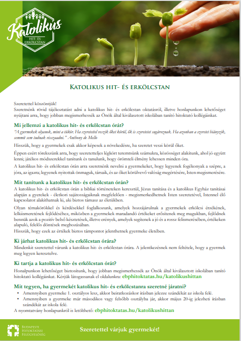 Önök, mint szülők nyilatkozhatnak arról, hogy kötelező tanórai foglalkozásként gyermekük számára az etika oktatást, vagy valamelyik, az Országgyűlés által elismert egyházak és azok belső egyházi jogi személye által folytatott hit- és erkölcstan oktatást választanak.